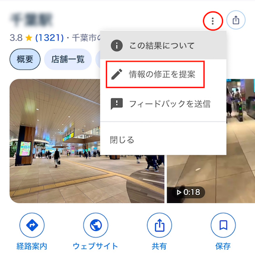 店舗名の右側にある3点リーダーをクリックすると、写真のような表示が出るので「情報の修正を提案」を選択します。