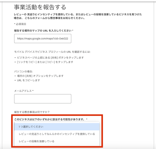 要はこれ、クチコミの見返りを提案されたり、投稿を依頼された患者、お客さんがGoogleに通報できるというもの。