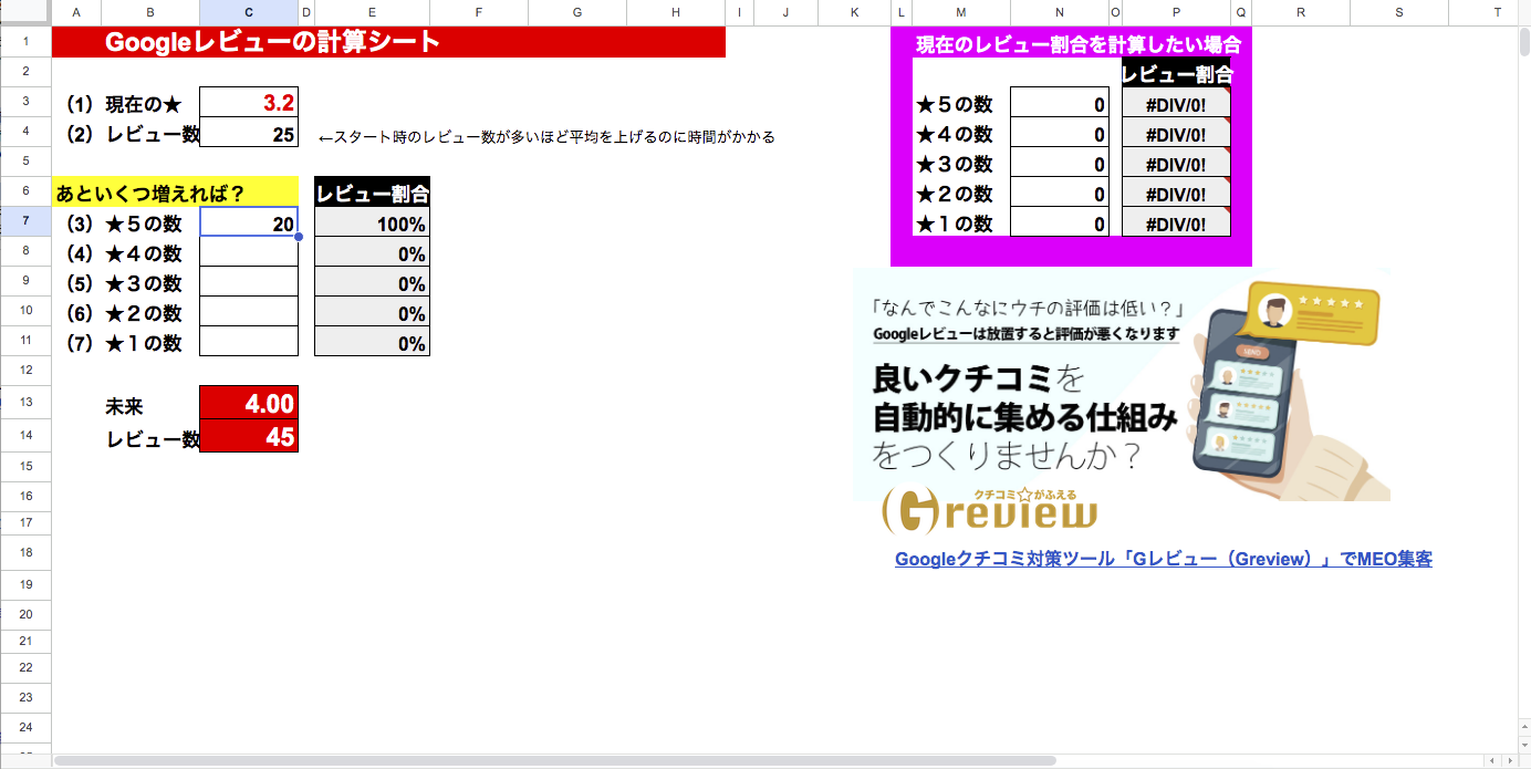 そこで、目標値までにいくつの評価が必要かを簡単に計算できるシートを作成しました。