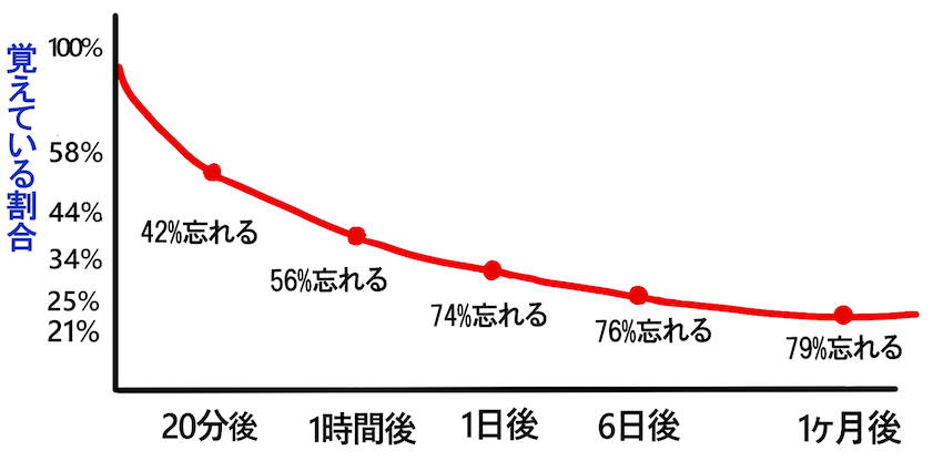 人が物事を忘れる割合を時間で示したグラフですが、これによると1時間で人は56%忘れ、さらに1日で74%のことを忘れます。