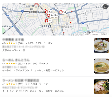 例えばGoogleで「千葉市中央区 ラーメン」と検索すると、以下のようなMAPが表示されます。
